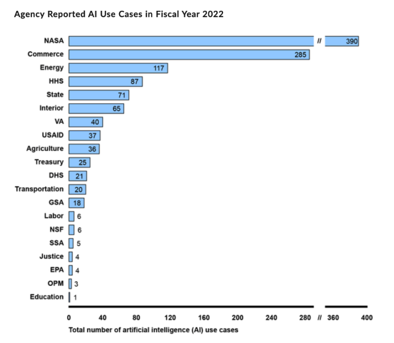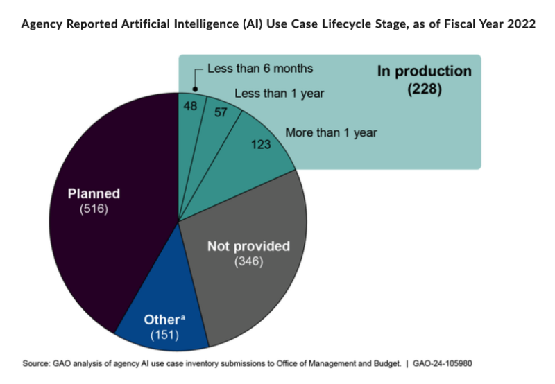The report relied on agency submissions to the Office of Management and Budget to analyze the current state of AI within the government. The robustness of these use cases varies across agencies. NASA and the Department of Commerce have bounded ahead of the others (390 and 285 respectively) followed by the Departments of Energy (117), Health and Human Services (87) and State (71). The majority of these use cases (516) are planned, while only 228 are in production. Overall, the report provided 35 recommendations, particularly praising the work of Commerce and the General Services Administration (GSA).